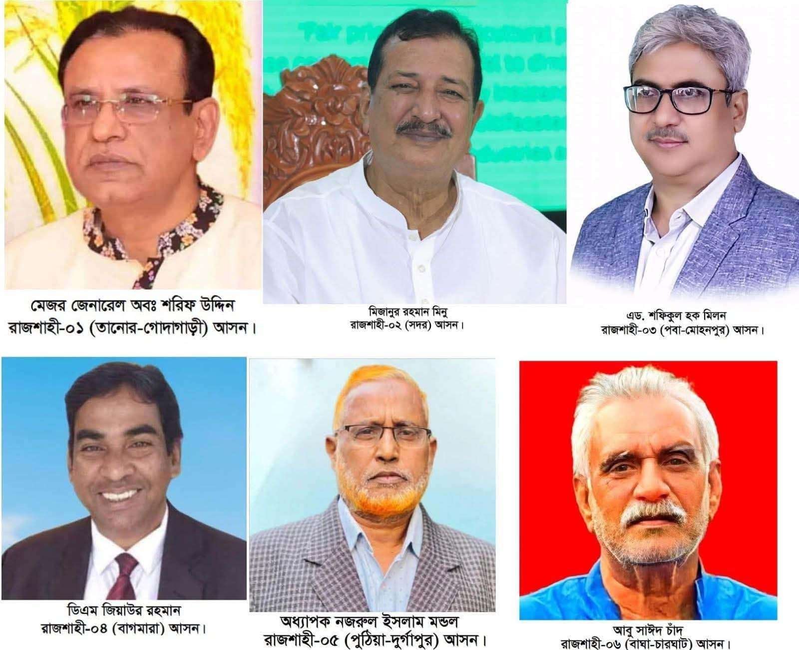 ঘোষণা অনুযায়ী, রাজশাহীর ছয়টি আসনের মধ্যে দুইটিতে এসেছে নতুন মুখ, আর চারটিতে পুরোনো প্রার্থীরাই পুনরায় টিকিট পেয়েছেন। এর মধ্যে নতুন মুখ হিসেবে প্রথমবার মনোনয়ন পেয়েছেন রাজশাহী-১ (গোদাগাড়ী-তানোর) আসনে মেজর জেনারেল (অব.) শরীফ উদ্দীন এবং রাজশাহী-৪ (বাগমারা) আসনে ডিএম জিয়াউর রহমান জিয়া।